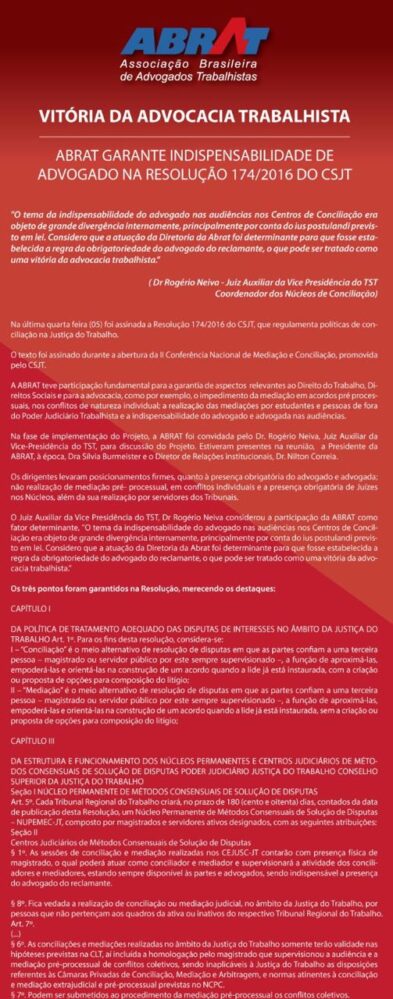 ABRAT garante indispensabilidade de advogados na resolução 174/2016 do CSJT