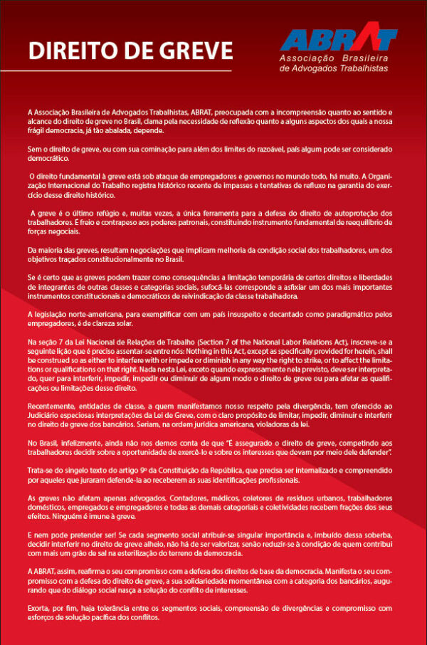 A Associação Brasileira de Advogados Trabalhistas, ABRAT, preocupada com a...